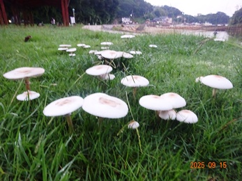 湿度の高い日々が続いているので、公園の芝生にキノコが出現し始めた。毒キノコである。