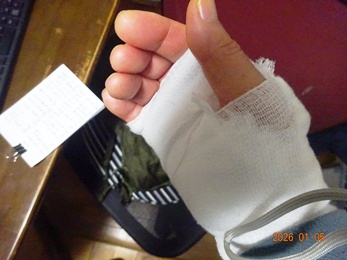 バネ指の手術は昨日無事に済んだ。現在は写真の様に包帯で「ぐるぐる巻き」である。手術後の痛みもなく”痛み止め”を服用することもなかった。